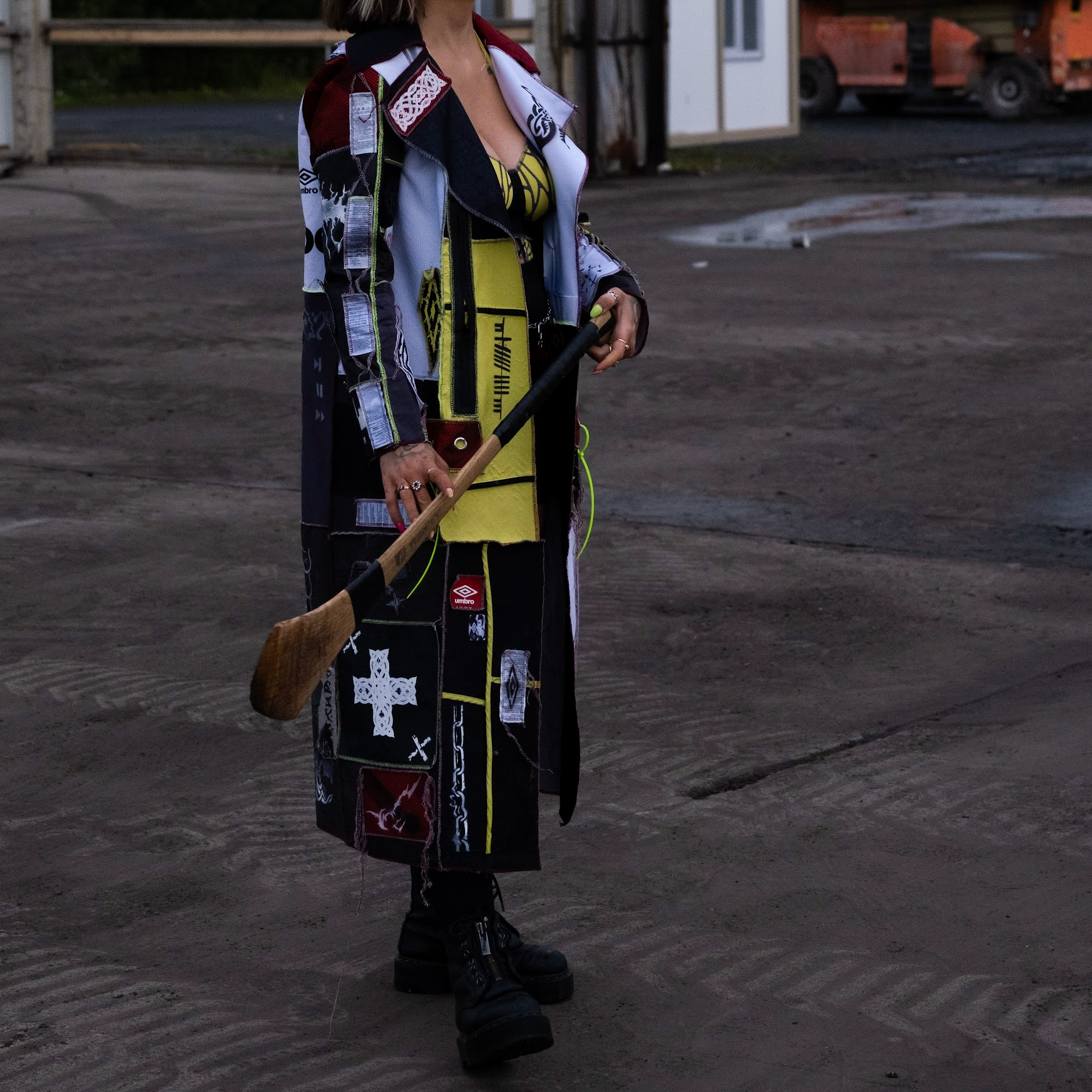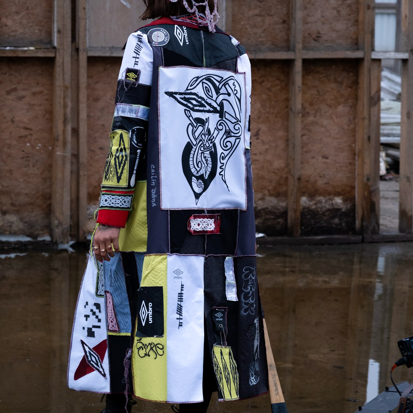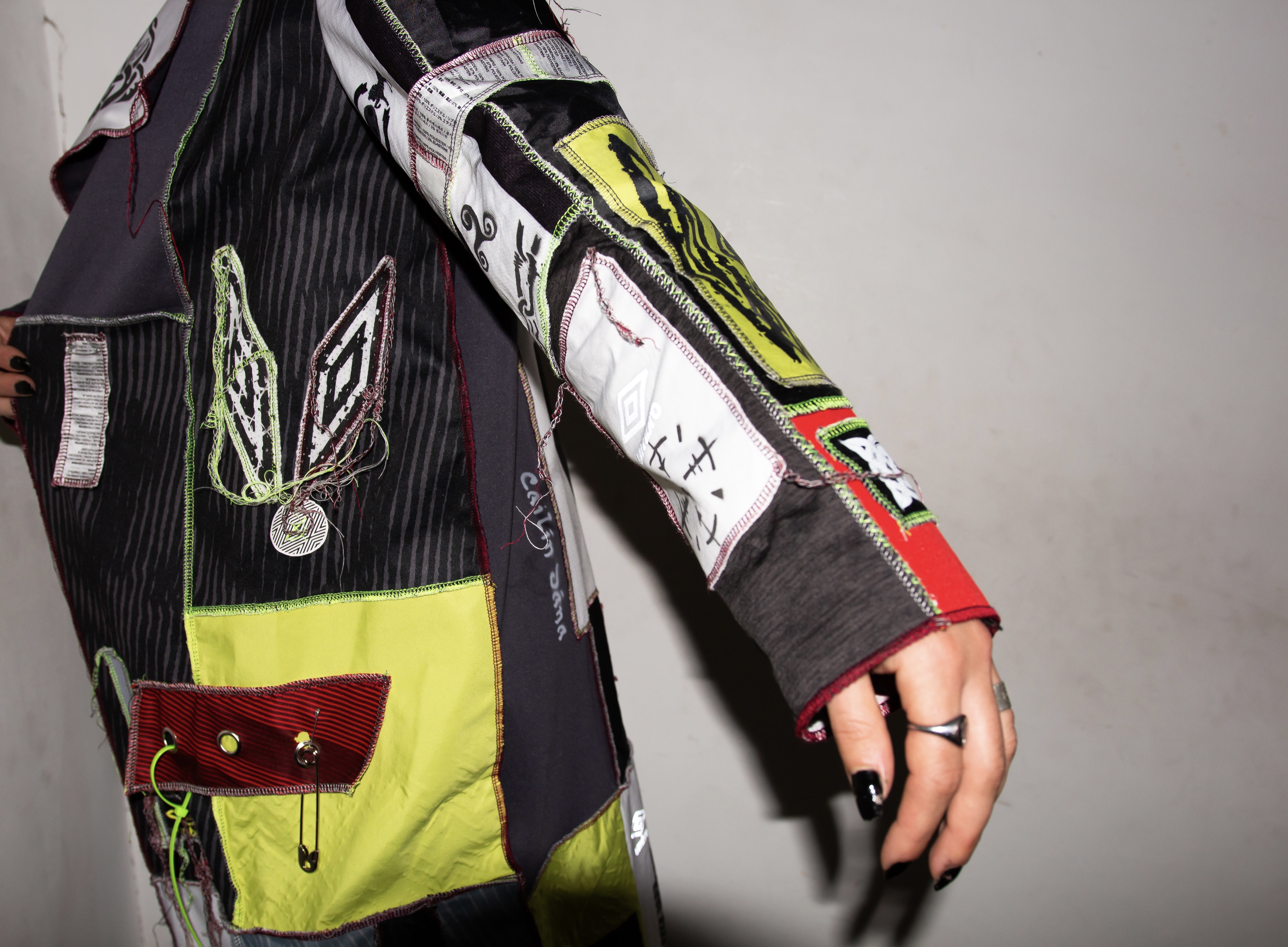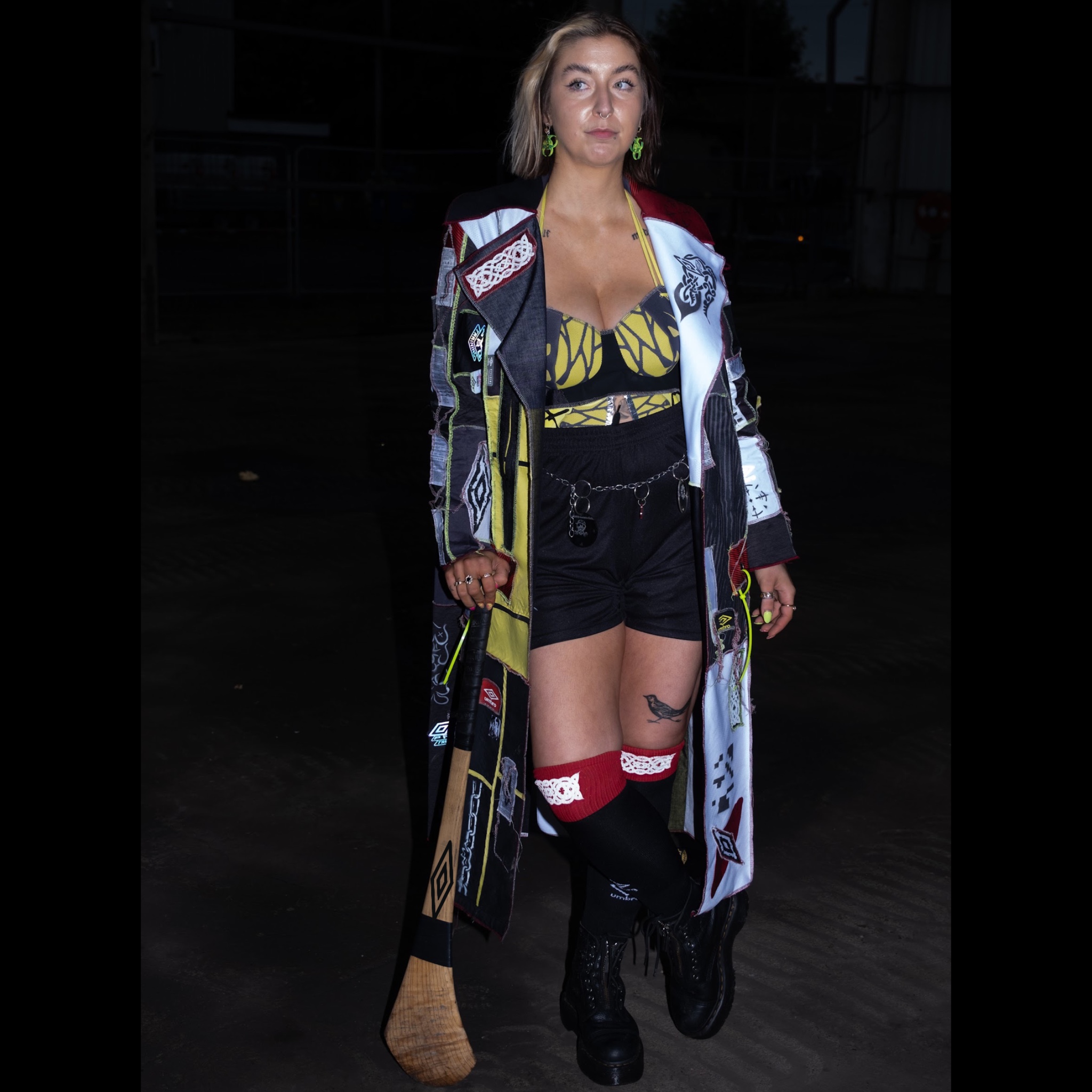 I tried to capture this duality of our culture through my hero imagery in my favourite city, Limerick. The jacket mimics brick street walls that are dotted with tags, umbro and Celtic style stickers and a big poster on the back of a screenprinted motif I created for the project. A statement piece for before and after partying. The green and white ties in to the limerick flag also. The look underneath is reworked bags and shorts eyeleted and screenprinted. I got my gorgeous friends involved to capture the social buzz of youth culture we experience together.