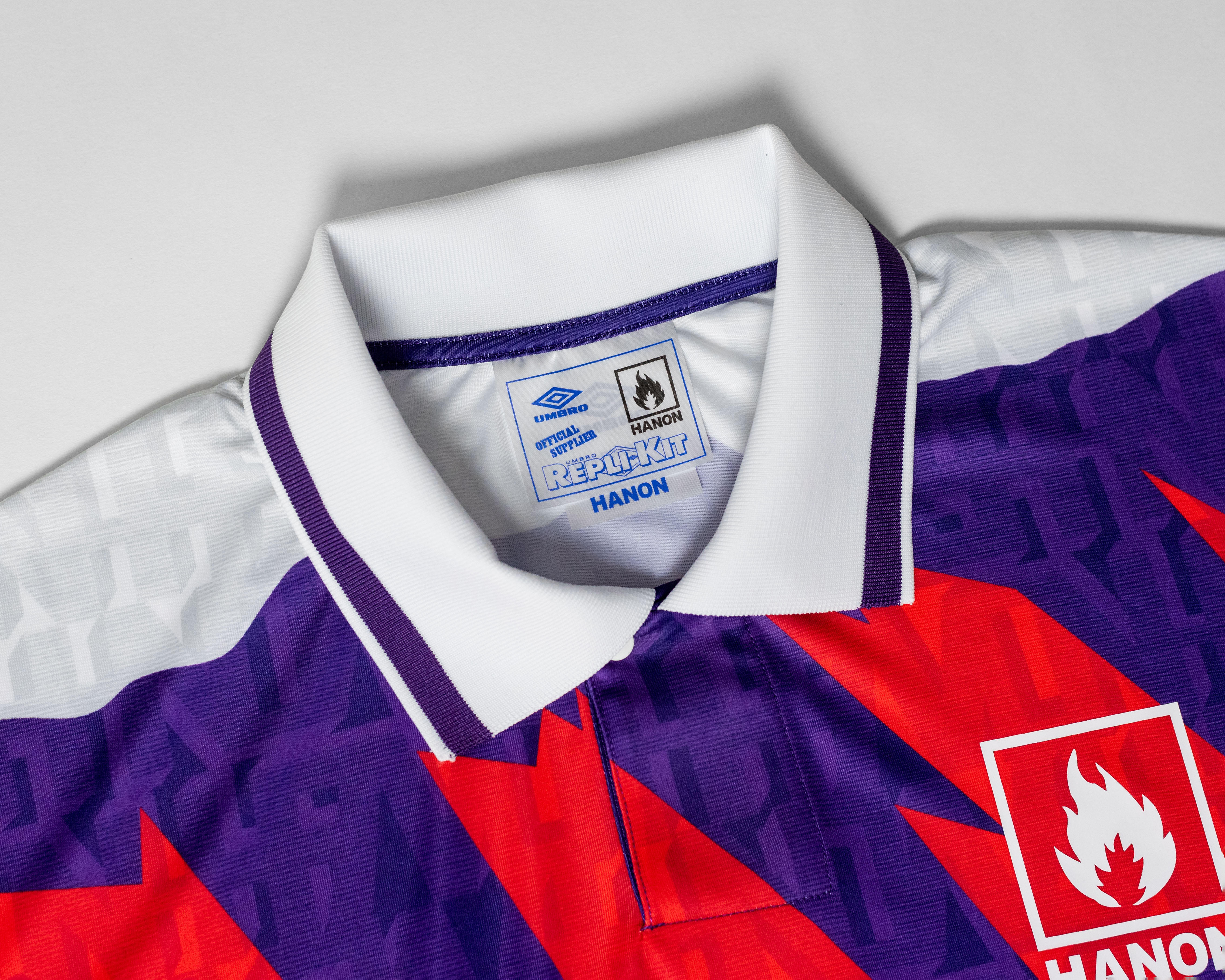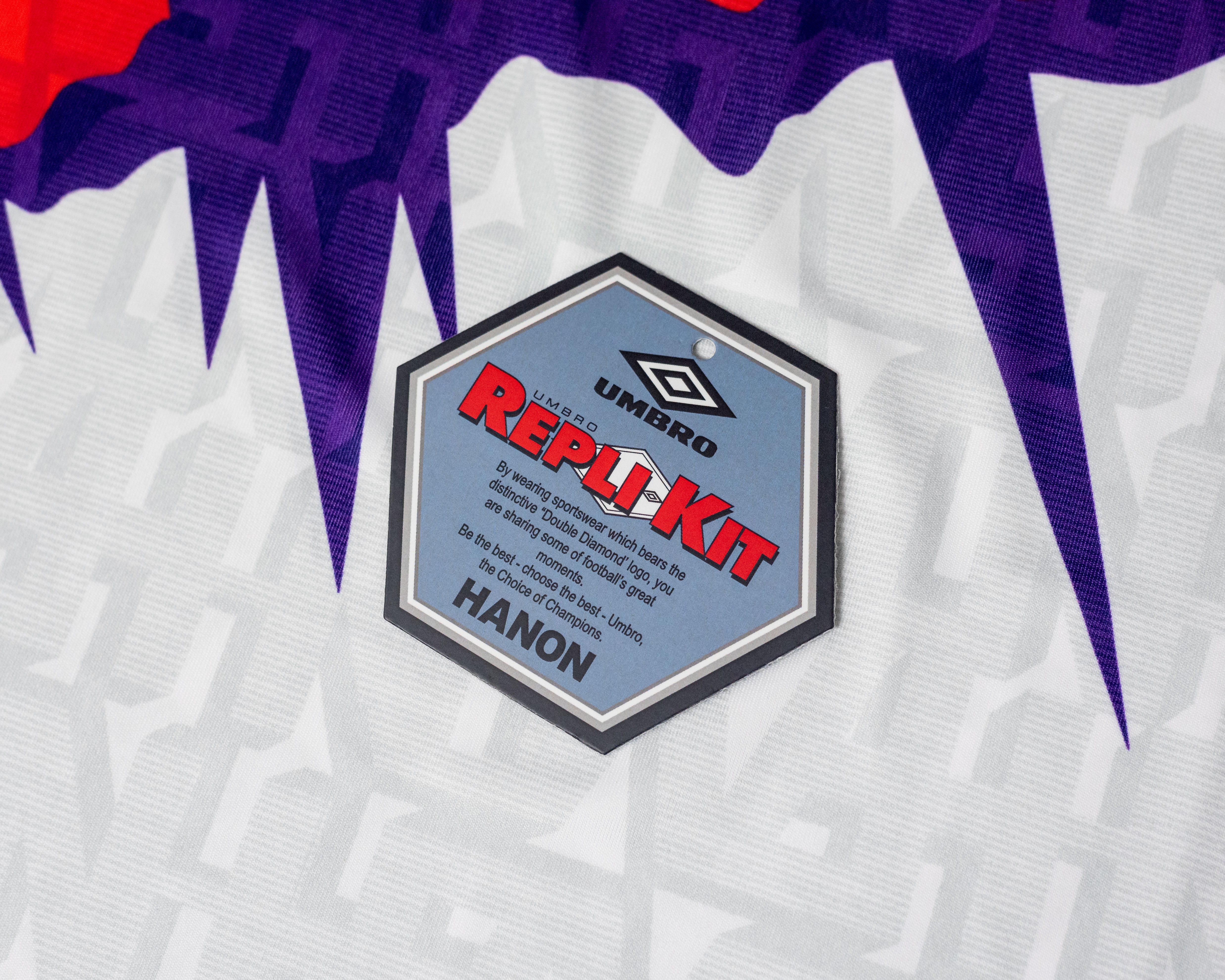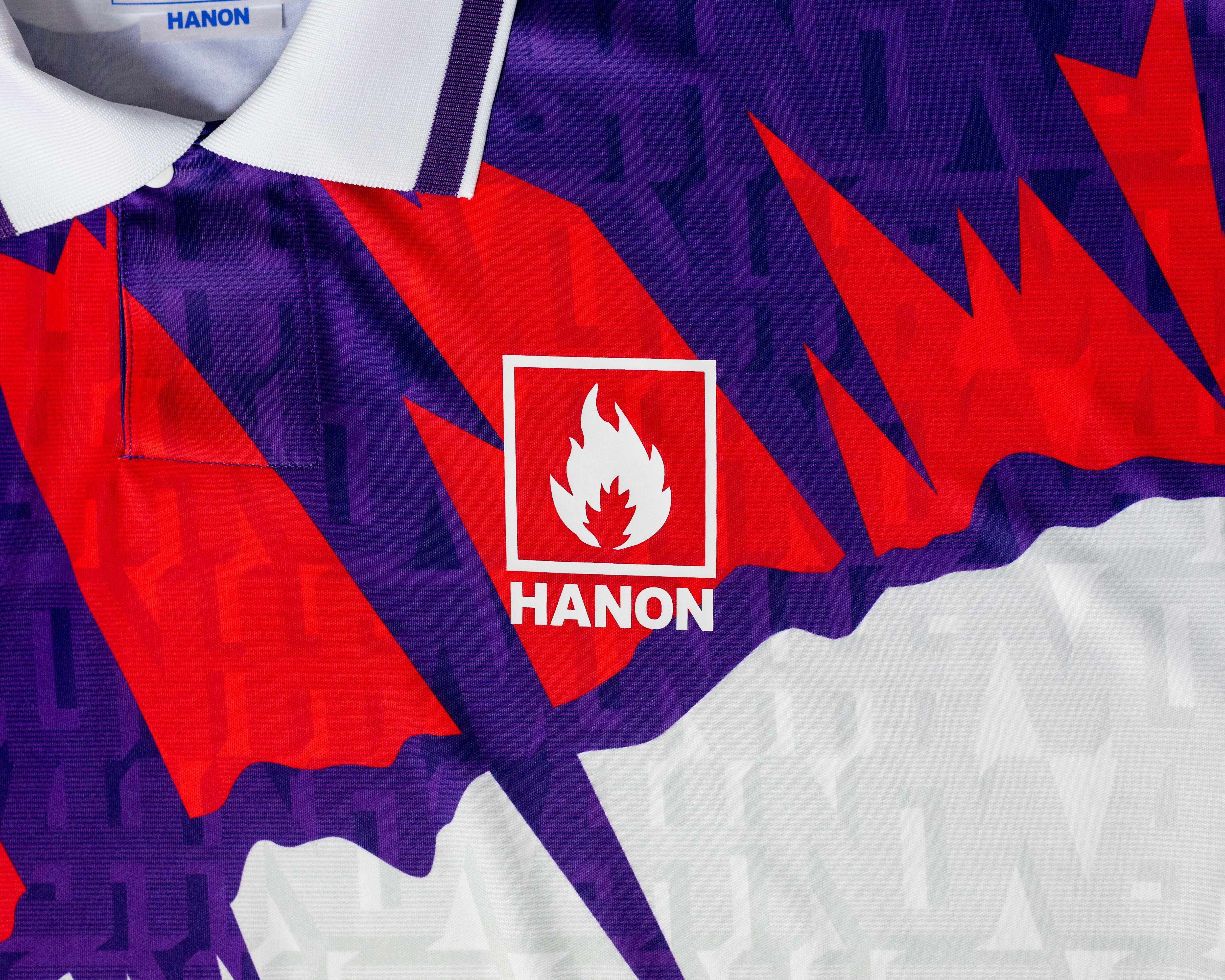 Le maillot présente un motif graphique en violet riche et rouge néon. Il a des manches de bras lâches et un col nervuré pour un ajustement détendu. Un double diamant vintage des années 90 et le logo HANON figurent sur la poitrine et il est également livré avec les étiquettes et l’emballage officiels de Repli-Kit.